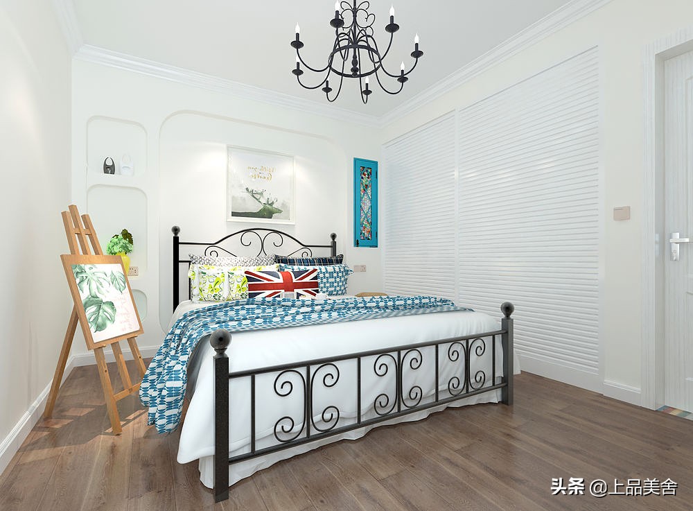 主卧的装饰十分简单,以简洁自然的白色为主,进门右边做了一个白色的衣柜,和房间的风格很搭,也增加了主卧的储物空间;再搭配黑色的床,和黑色的水晶吊灯,黄色花瓶的点缀,使整个环境融为一体;背景墙的一些小设计也让房间格调十足。