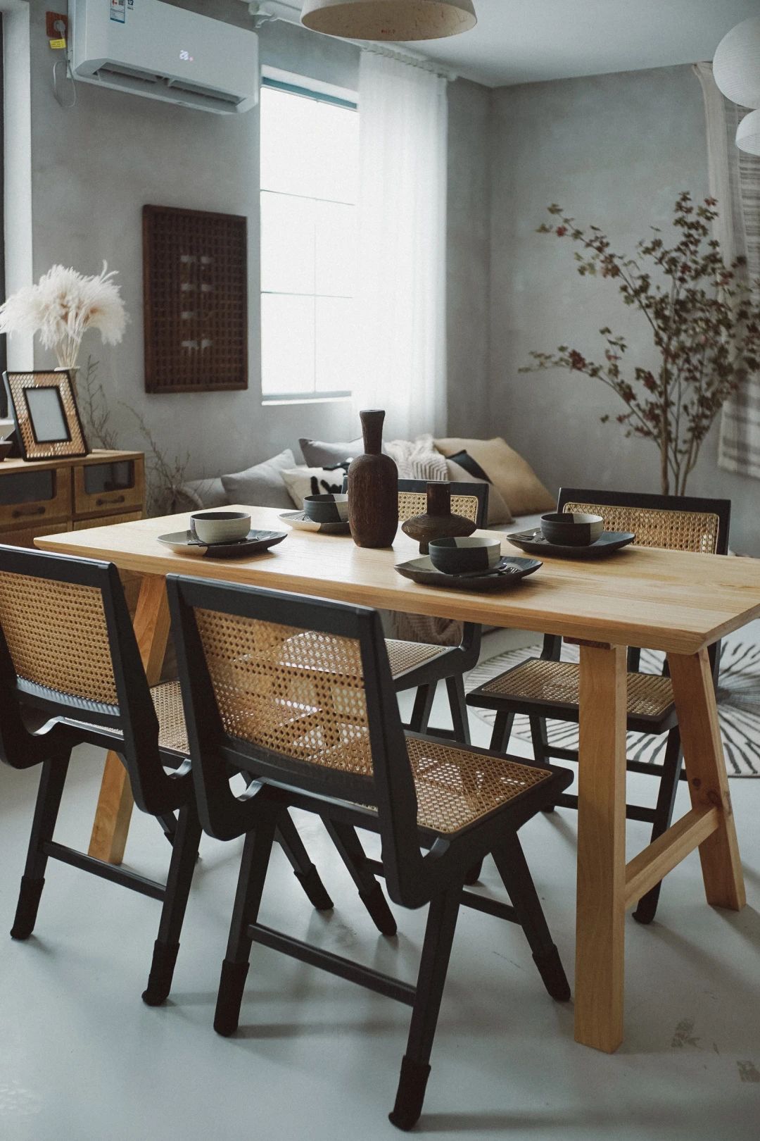 餐椅和客厅的单人椅都是黑子边框和藤编组合,自带沉静有质感的气息。