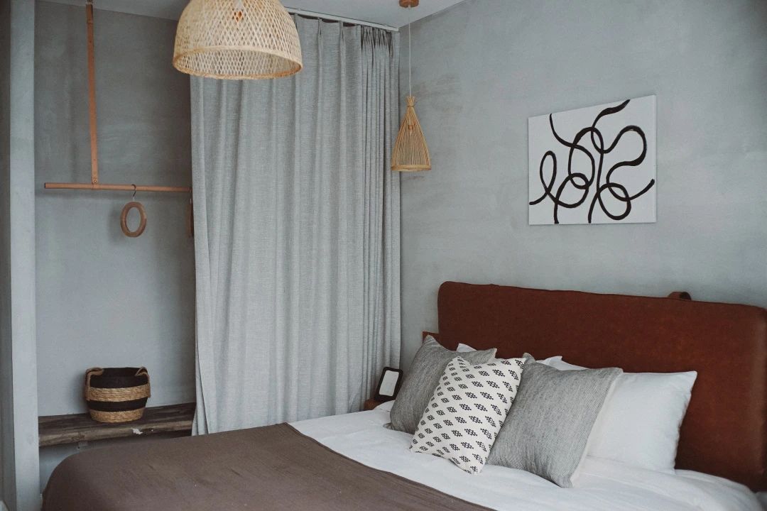 卧室整体更加简约清爽,装了几盏藤编罩吊灯,晚上开灯的时候,会投下斑驳的光影,带来一种曼妙的情调。